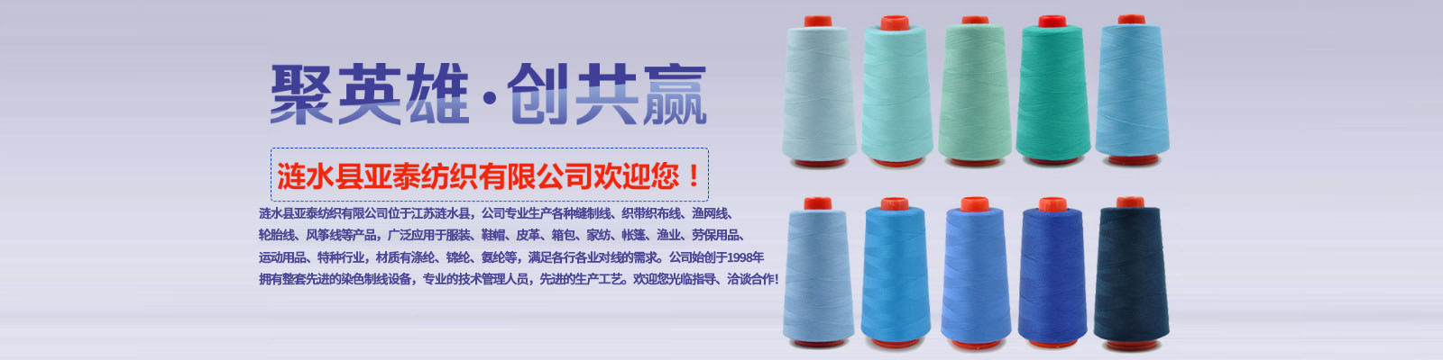 漣水縣亞泰紡織有限公司位于江蘇漣水縣,公司專業生產各種縫制線、織帶織布線、漁網線、輪胎線、風箏線等產品,廣泛應用于服裝、鞋帽、皮革、箱包、家紡、帳篷、漁業、勞保用品、運動用品、特種行業,材質有滌綸、錦綸、氨綸等,滿足各行各業對線的需求。公司始創于1998年,擁有整套先進的染色制線設備,專業的技術管理人員,先進的生產工藝。歡迎您光臨指導、洽談合作!